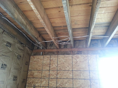 So I showed up around 9:00 on Saturday morning, completely caffeinated with a truck load of tools and cable. We got right to it and had the wiring done in no time and most of the insulation. Things went so well that based on the amount of work we had completed and the fact it was pretty foggy that day we started drinking at 2:30 cause we thought it had to be like 5 o'clock! Might of been a poor decision on our part cause Michelle ended up with some catch up to do when she got there after her Volleyball tournament.